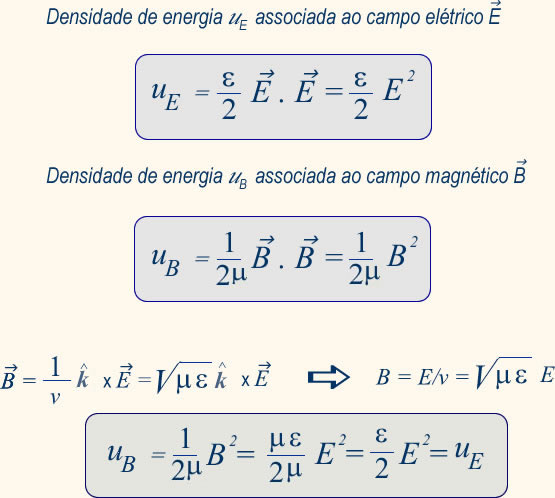 Veja que interessante! Em uma onda eletromagnética plana, a cada instante, metade da energia está armazenada na forma de energia elétrica e metade na forma de energia magnética!